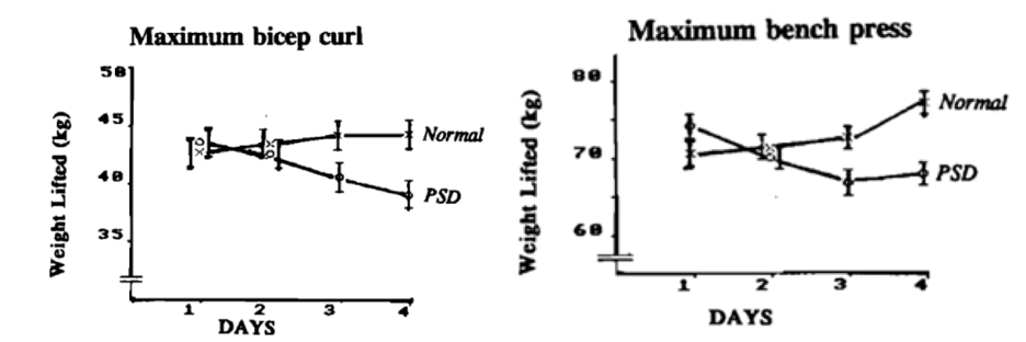 A study conducted by Reilly & Piercy (2007) evaluated the effects sleep loss has on athletic performance. In this study, eight healthy males aged 18-24 years old were subject to 8 (±1) hour periods of sufficient sleep per night in addition to periods of only 3 hours of sleep per night. In both cases, the participants completed heavy weightlifting work-out exercises (bicep curl, bench press, leg press, and deadlift) and were evaluated on their perception of effort and weight lifted. By comparing these two conditions, researchers were able to define an overall 15-20% decline in effort and amount of weight lifted in during the periods of sleep deprivation (Figure 4).