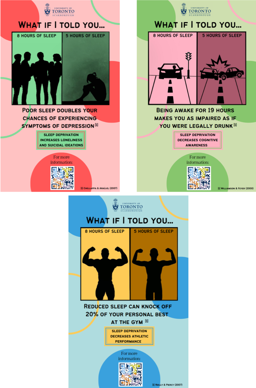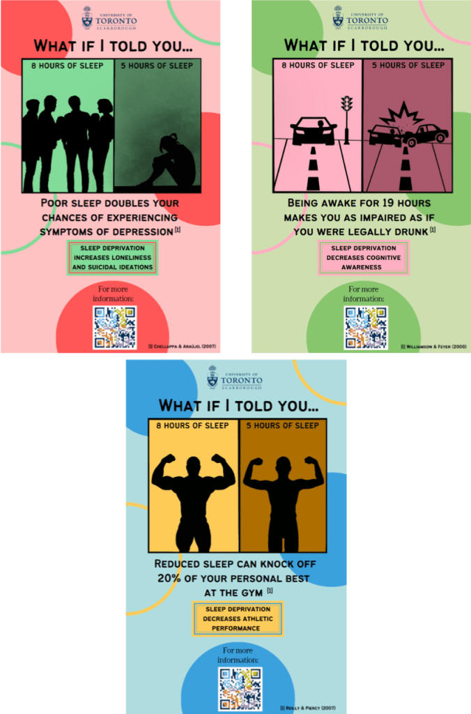 A further practical example for university administration is for Wellness centers to provide students with sleep education resources, in addition to sleep experts and therapists that will help undergraduates overcome sleep depriving tendencies. This can be further achieved by implementing courses and regular seminars about the importance of sleep and how to maintain a healthy relationship with sleep. For this review paper, we provide example of posters to be distributed by university wellness centers regarding the impact of sleep on the student experience (Figure 7 and supplementary material).