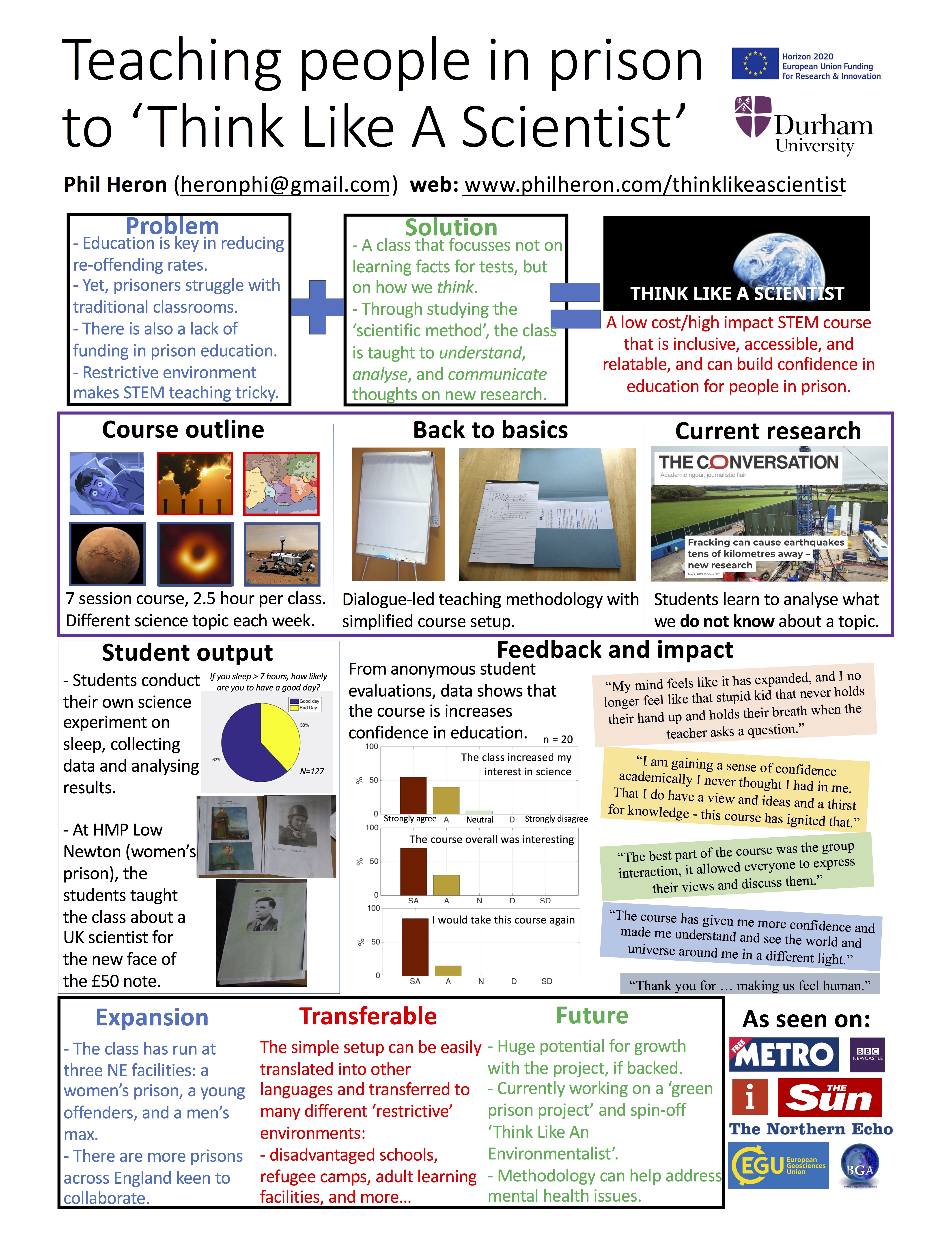 Think Like A Scientist started in 2017 in the English prison system and has recently featured in prisons in Australia (2024-2025), Spain (2025), and Canada (2023-present). However, we have run the courses in other settings, including schools, adult learning facilities, and youth work (both online and in person). The success of the course is based around the creation of a classroom dynamic that is accessible, inclusive, and relatable to students from all backgrounds.
